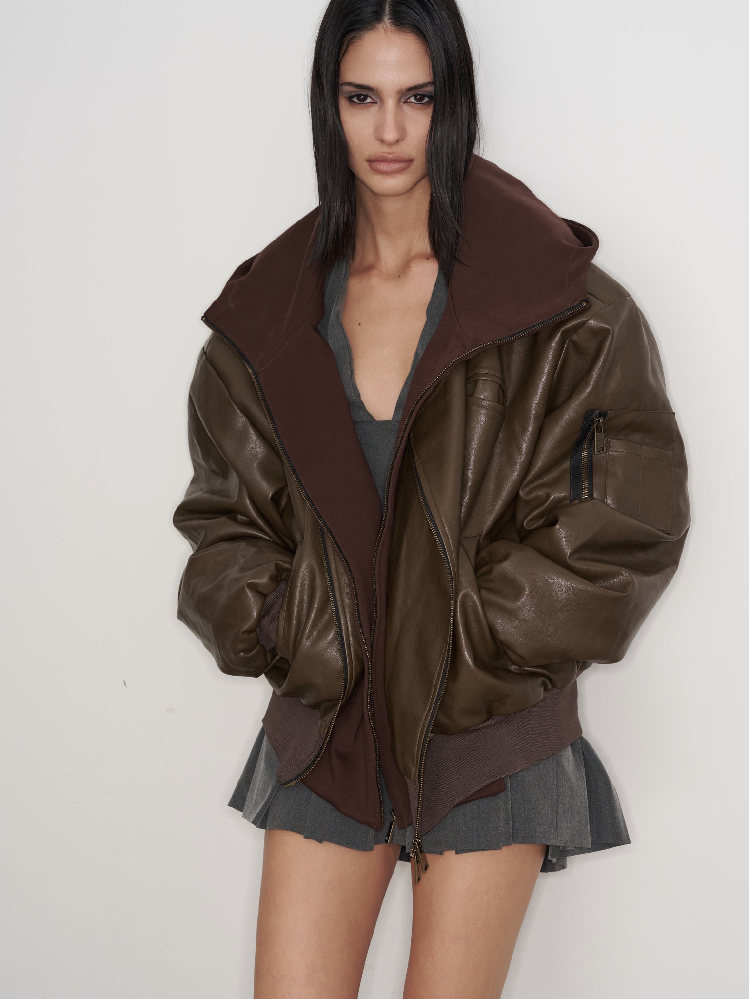 - Oversized Leather Bomber Jacket in Brown